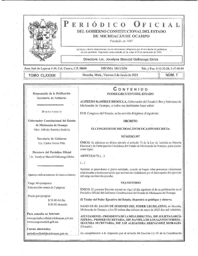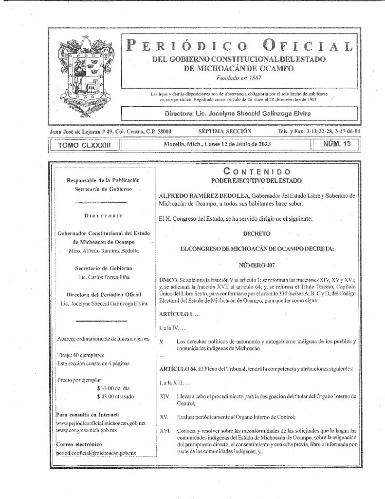 El gobernador Alfredo Ramírez Bedolla, publicó finalmente este jueves 15 de junio en el Periódico Oficial del Estado 5 reformas al Código Electoral de Michoacán, pero con fecha diferente a su aprobación por el pleno legislativo, de tal manera que entraron en vigor cuando todavía los diputados no las habían votado.