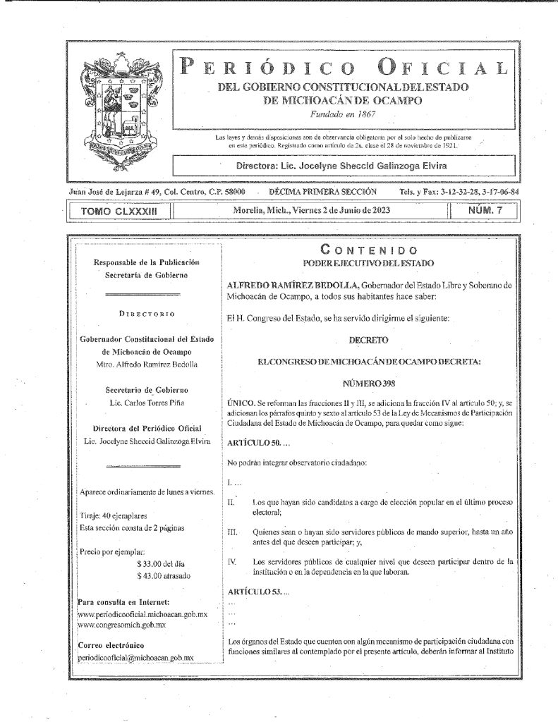 El mismo caso ocurre con el decreto 398, que se refiere a la Reforma a la Ley de Mecanismos de Participación Ciudadana, para regular la integración de exfuncionarios en observatorios ciudadanos.