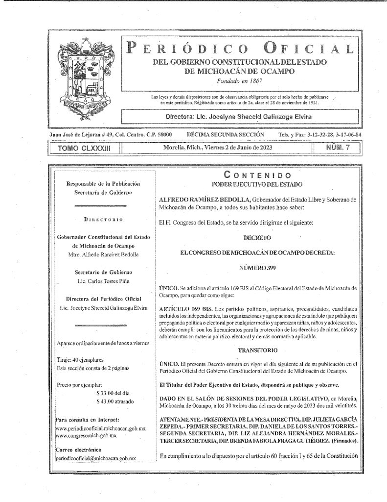 El Decreto 399, se refiere a una reforma al Código Electoral del estado, relativa a la participación de menores de edad en la publicidad de partidos y candidatos. La modificación fue aprobada el 30 de mayo, pero fue publicada el 15 de junio con fecha del 2 de ese mes.