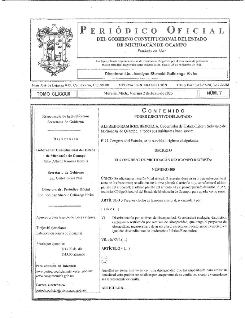 El Decreto 400 publicó la Reforma al Código Electoral en tema de discriminación y discapacidad, que fue aprobado el 30 de mayo y publicado hasta el 15 de junio, pero con fecha de publicación del 2 de junio.
