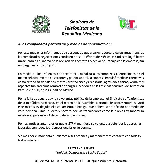Añadieron que por la falta de acuerdos y la no voluntad política de la empresa, el Sindicato de Telefonistas de la República Mexicana votó previamente por el inicio de la huelga y se ratificó este jueves.