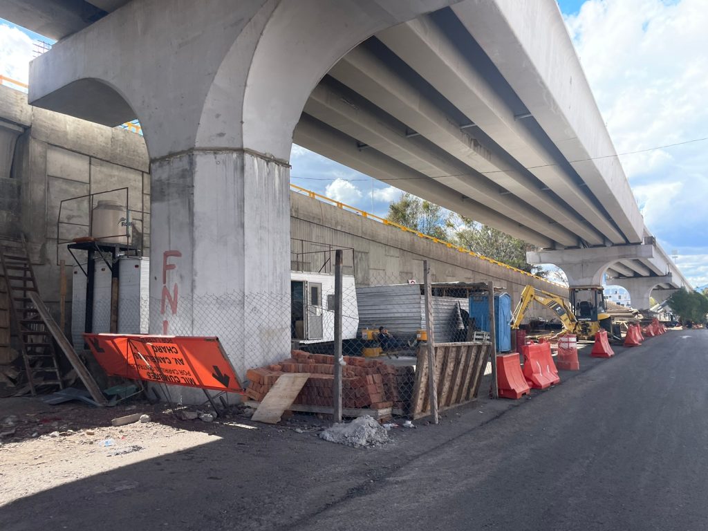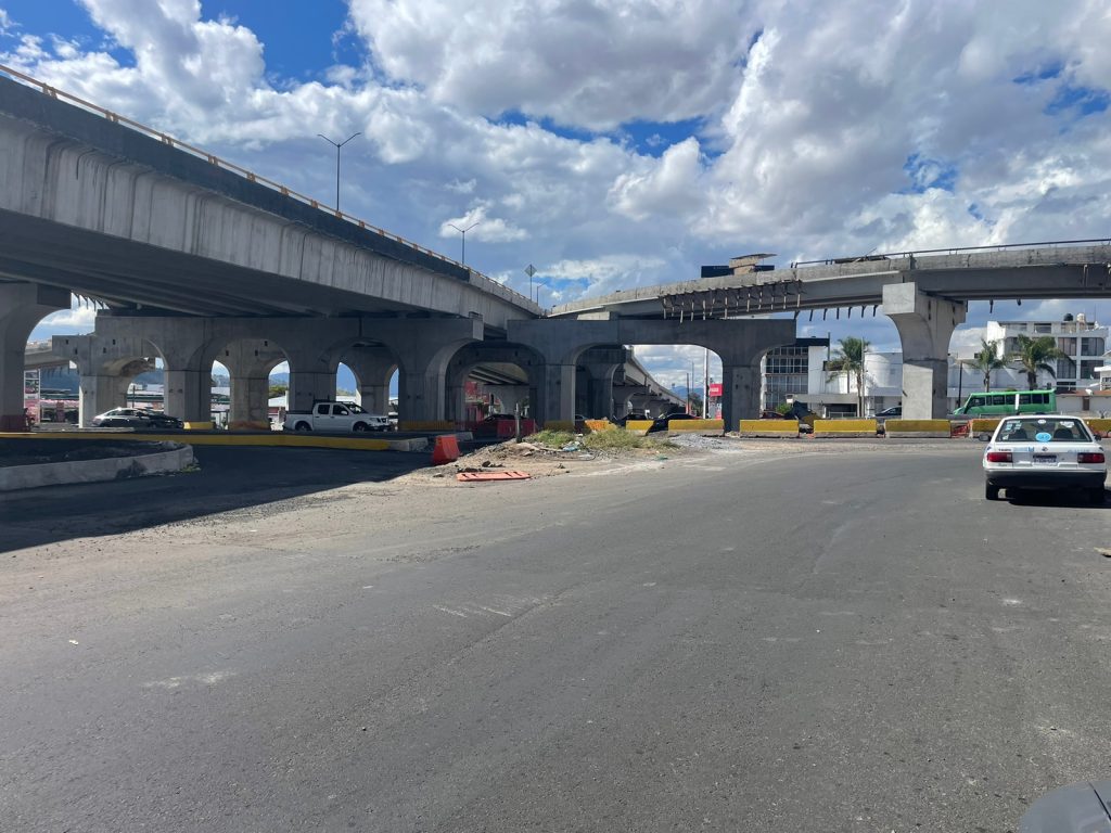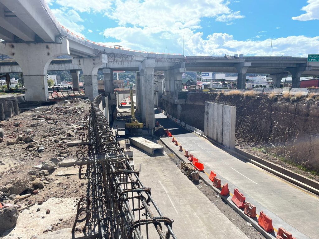 Tramos de la vialidad están cubiertos todavía de tierra y grava; incluso con las estructuras de fierro al descubierto, mientras en las inmediaciones se mantiene la maquinaria, el material de construcción y el personal trabajando.