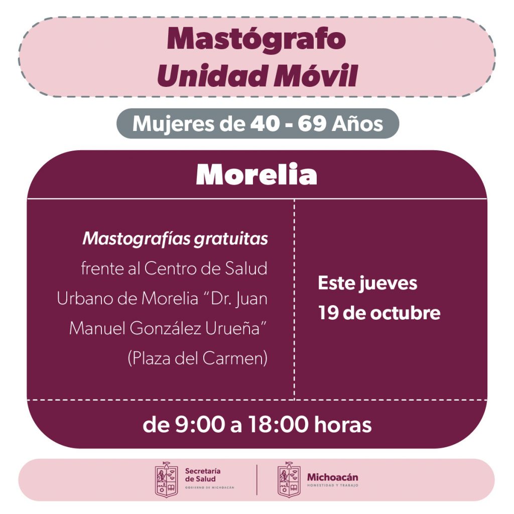 En el centro de salud de Morelia, ubicado en la calle Benito Juárez 225, en el Centro Histórico de Morelia, frente a la plaza del Carmen, será instalado un mastógrafo móvil donde las mujeres serán atendidas sin cita de 9:00 a 18:00 horas.