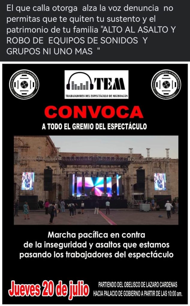 Para denunciar la ola de asaltos de que han sido objeto en las últimas semanas, Trabajadores del Espectáculo de Michoacán (TEM) marcharon este jueves en Morelia, desde el Obelisco a Lázaro Cárdenas hasta el centro de la capital michoacana.
